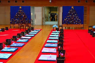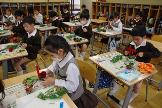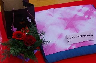 1年生の子ども達がこの日のために心をこめて用意した作品 ―アサガオのつるで作ったリース、セロハンで作ったステンドグラス、自分で染めたざぶとんカバー、お客様にあてたメッセージ入りお席札、クリスマスカラーのいけばな、お持ち帰り用紙袋― が華やかにお客さまをお迎えしました。
