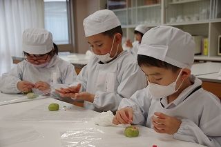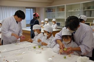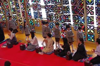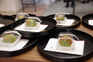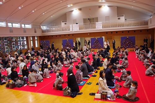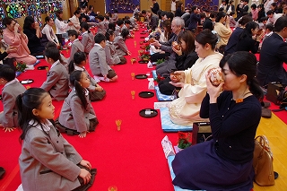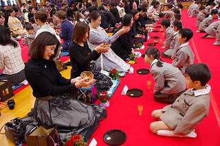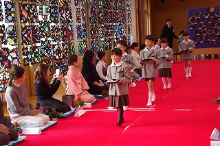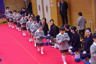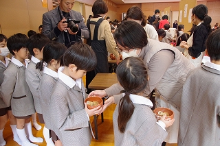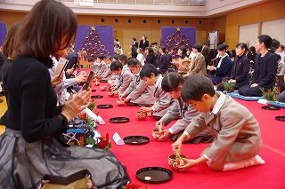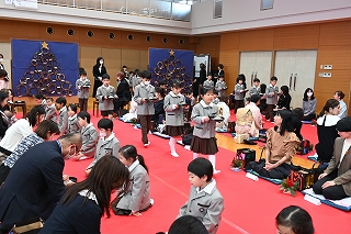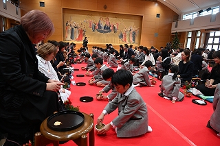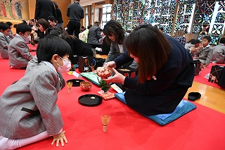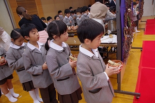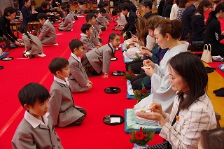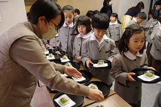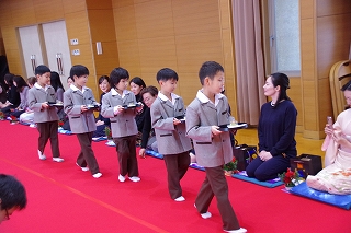 子ども達がお菓子を運んで入場します。御菓名は「聖夜」、京菓子の「老松」様の方々に教えていただいて、前日に一人ひとりがお客さまのために作りました。茶道サークルのお母様方が子ども達に本人が作ったお菓子を確かめながら手渡してくださいました。菓子盆を注意深くまっすぐに持って、子ども達はお客様にお出ししました。