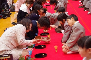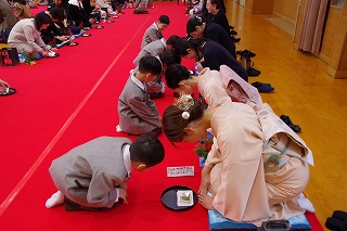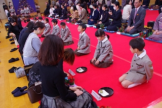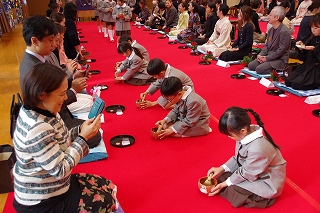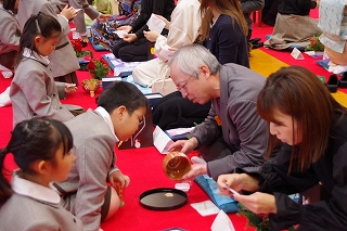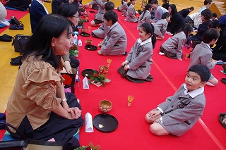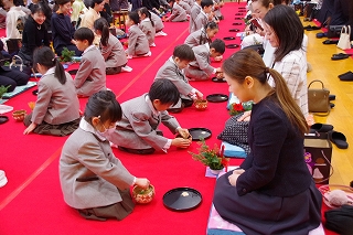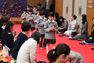 1年生は総合的な学習の時間に学んだ礼法をいかして、家族 ―おばあさん、おじいさん、お母さん、お父さん― をお客様としてお迎えし、この大茶会でおもてなしすることで自分達の感謝の気持ちを表現しました。