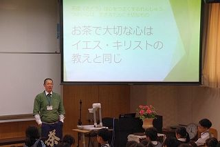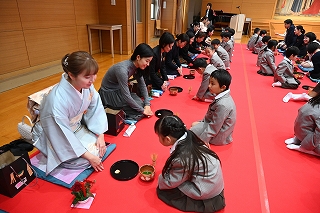 12月7日、1年生の学習発表会「大茶会」が講堂で開かれました。お家の方をお客様としてお招きし、おもてなししました。