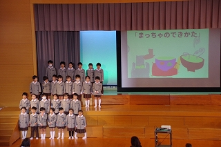 代表児童のあいさつと、お茶にちなんだ英語の歌 “I’m a Little Teapot” を全員で歌って大茶会が始まりました。続いて1組の「お茶の歴史」、2組の「お茶ができるまで」の発表がありました。