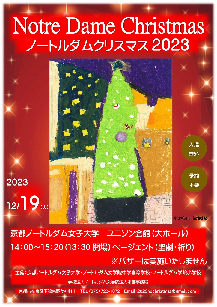 来る12月19日(火)に、ノートルダム学院小学校、ノートルダム女学院中学高等学校、京都ノートルダム女子大学の三校合同で ノートルダム クリスマス 2023が開催されます。