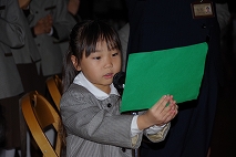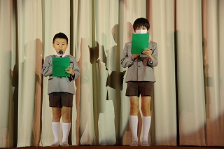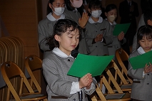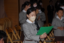 キリストの誕生を祝う人々に続き、各クラスの代表の子ども達も捧げ物(アドベントカード)を持って登壇しました。クリスマスを待つ待降節(アドベント)の間に人々のためにした小さな犠牲や良い行いを捧げます。