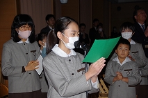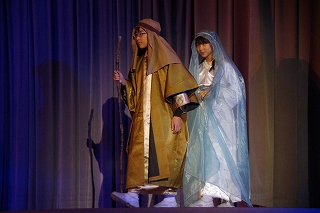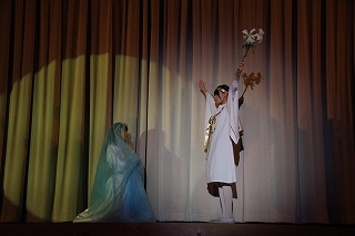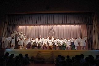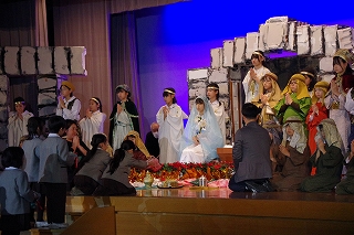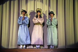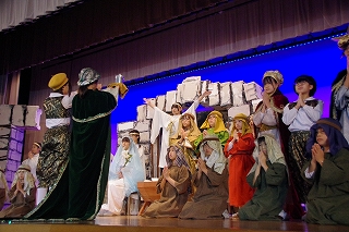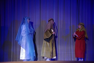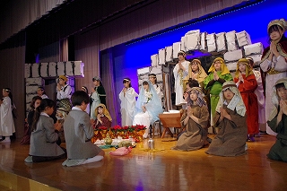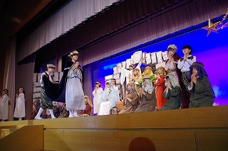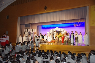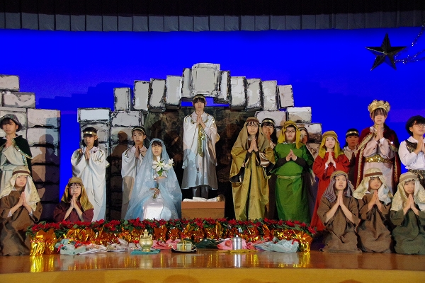 「クリスマスへの招き」を3年生と6年生の代表児童が朗読し、タブローが始まりました。いちばん初めのクリスマスの日に起こったこと、つまりイエス・キリストの誕生を祝う聖劇です。セリフはなく、ナレーターが代わりにセリフを言います。高学年の子ども達がタブローを演じました。