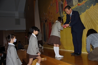 クラス代表の子ども達が学校からのクリスマスプレゼントを受け取りました。