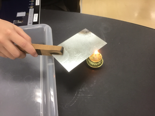 金属、水、空気を調べます。まずは金属から。「あたたまっているかどうやったら分かる?」との問いに色々な方法が挙げられた中、「見て分かると一番いいね」ということになり、温度変化がわかる示温テープやロウを金属につけて実験しました。