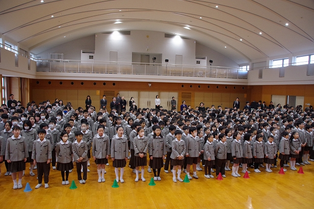 講堂に1年生から5年生の児童、教職員が集い、修了式を行いました。