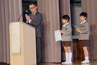 5年生の代表児童が朗読する聖書のことばを聞いた後、校長先生の話を聞いて、1年をふり返りました。