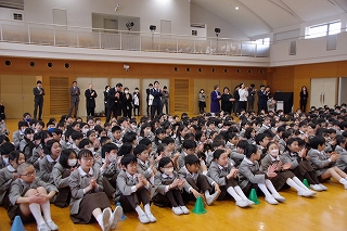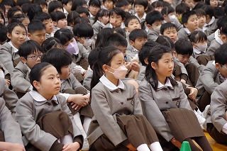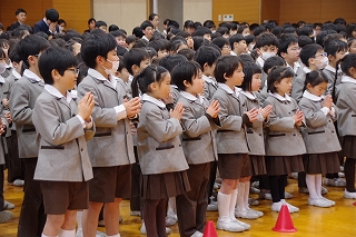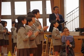 教頭先生が在校生全員の今年度の課程の修了を宣言しました。その後、退職する先生方のあいさつを聞きました。今までの感謝を込めて拍手を送りました。