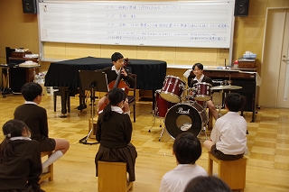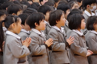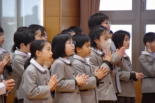 5年生の代表児童が朗読する聖書のことばを聞いた後、校長先生の話を聞いて、1年をふり返りました。