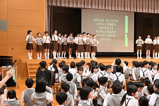 今日は、新入生歓迎会がありました。児童会執行委員が、初めと終わりの挨拶、進行を担当して活躍しました。5・6年生は学校生活や行事を劇と歌で紹介し、2・3・4年生からは、お祈りのカードが手渡されました。各学年素敵なプレゼントを考え、1年生は大喜びでした。1年生は、応援団のお兄さんとお姉さんがたくさんいることに気が付いたことでしょう。