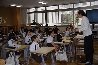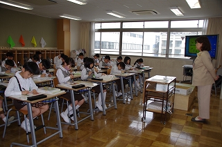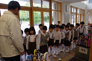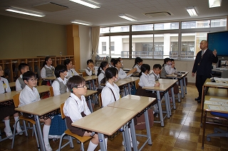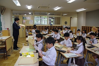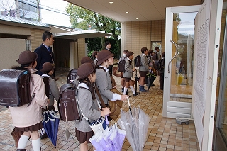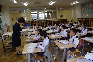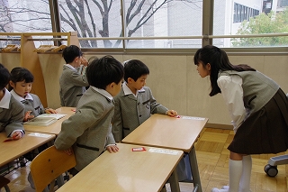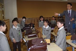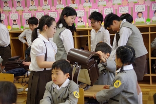 1年生の教室では、入学したばかりの1年生パートナーのために6年生が朝の支度のお手伝いをしていました。
