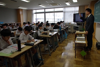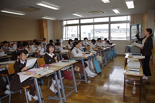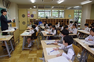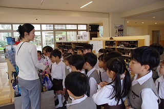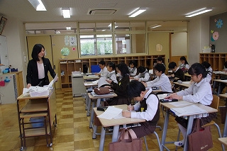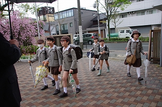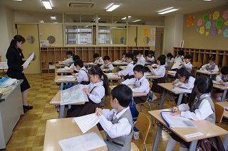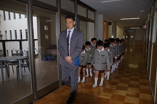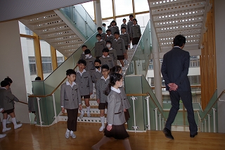 講堂に集まって始業式を行います。始業式に出席するため、担任の先生と一緒に整列して静かに講堂に向かいました。