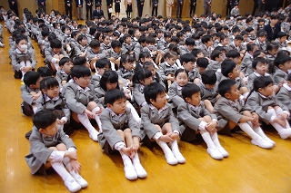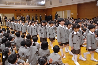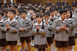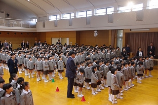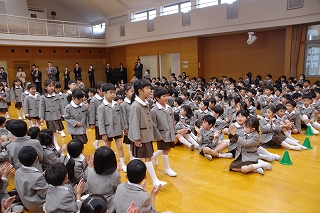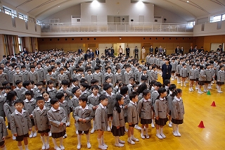 始業式は2年生以上の子ども達が先に入場し、入学したばかりの1年生を拍手で迎えました。