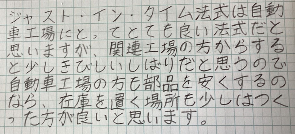 ムリ・ムダ・ムラをなくす「ジャストインタイム」方式という制度や、組み立て工場の洗練されたシステムについて理解を深めているのが、子どもたちのふりかえりから分かります。