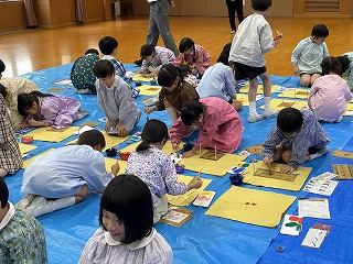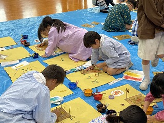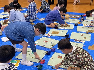 子どもたちは、お話を聞いた後に自分たちですきな柄を選んで染めていました。