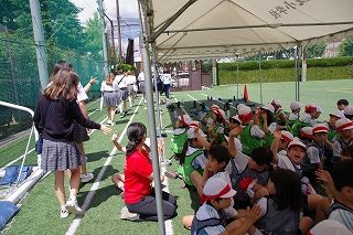 子ども達はお客さまに話しかけたくて次々に手をあげ、”What animal do you like?” “What food do you like?” などの質問をしていました。