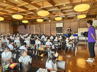 朝、学校からバスで出発し、お昼前に到着しました。お世話になるホテルの方々にあいさつをして、昼食をいただきました。