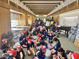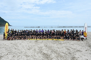 子ども達、教員一同に加え、救命士・医師としてサポートに来てくれた2名の卒業生、踏水会スタッフの方々、ライフセーバーの方との記念写真です。