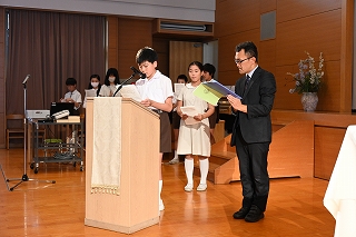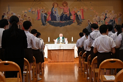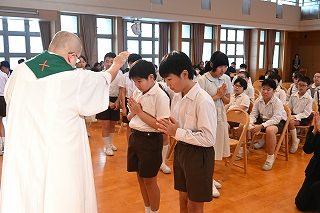 学校に戻って、教職員も6年生と一緒に参列をして、みことばの祭儀が行われました。神父様は今日1日のまとめをしてくださり、各クラスの代表が修養会の学びを共同祈願として祈りました。そして最後に、神父様が6年生一人ひとりに按手をしてくださり、神様からの祝福をいただきました。