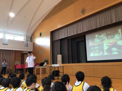 そしてみんながとっても楽しみにしているのが、おいしいお菓子。お菓子を作る前に、和菓子の魅力や種類などについて、「老松」の太田先生に、直接お話を聞くことができました。ホンモノのお話を聞けるということで、1年生のみんなは興味津々。