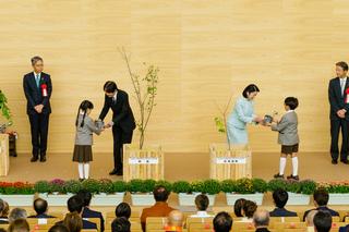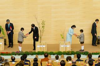 この式典で、日本植物園協会の総裁を務められている秋篠宮皇嗣殿下と妃殿下紀子さまが記念植樹をされました。その際に使われるスコップとじょうろをお渡しするという大役を本校児童が務めさせていただきました。