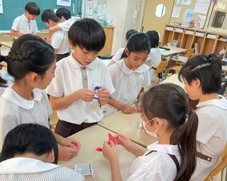 その内容を5年生全クラスにプレゼン発表をしにまわり、一緒に千羽鶴を折る仲間を募る子どもの姿が見られました。