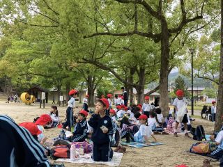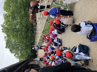 お天気が気になっていた遠足は、曇り空ではありましたが、予定通り本日全校一斉に実施しました。私は、1年生の引率として宝が池公園子どもの楽園に行きました。狐坂を上がり、宝が池のまわりを歩いてから平安騎馬隊を見学しました。そのあと、「法」の山からやって来た2年生と子どもの楽園で合流し、お家の方の愛情がいっぱい詰まったお弁当をいただきました。自由時間には、滑り台やブランコなど友だちと楽しく遊んでいましたが、雨が降ってきたので、予定を早めて帰校することにしました。