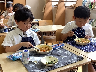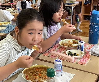 給食の先生方が、1回目の実施を踏まえて、より子ども達になじみのある食材やスパイスの配合や量を考えてくださいました。どの学年からも「おいしい!!」の声が聞こえて、安心しました。