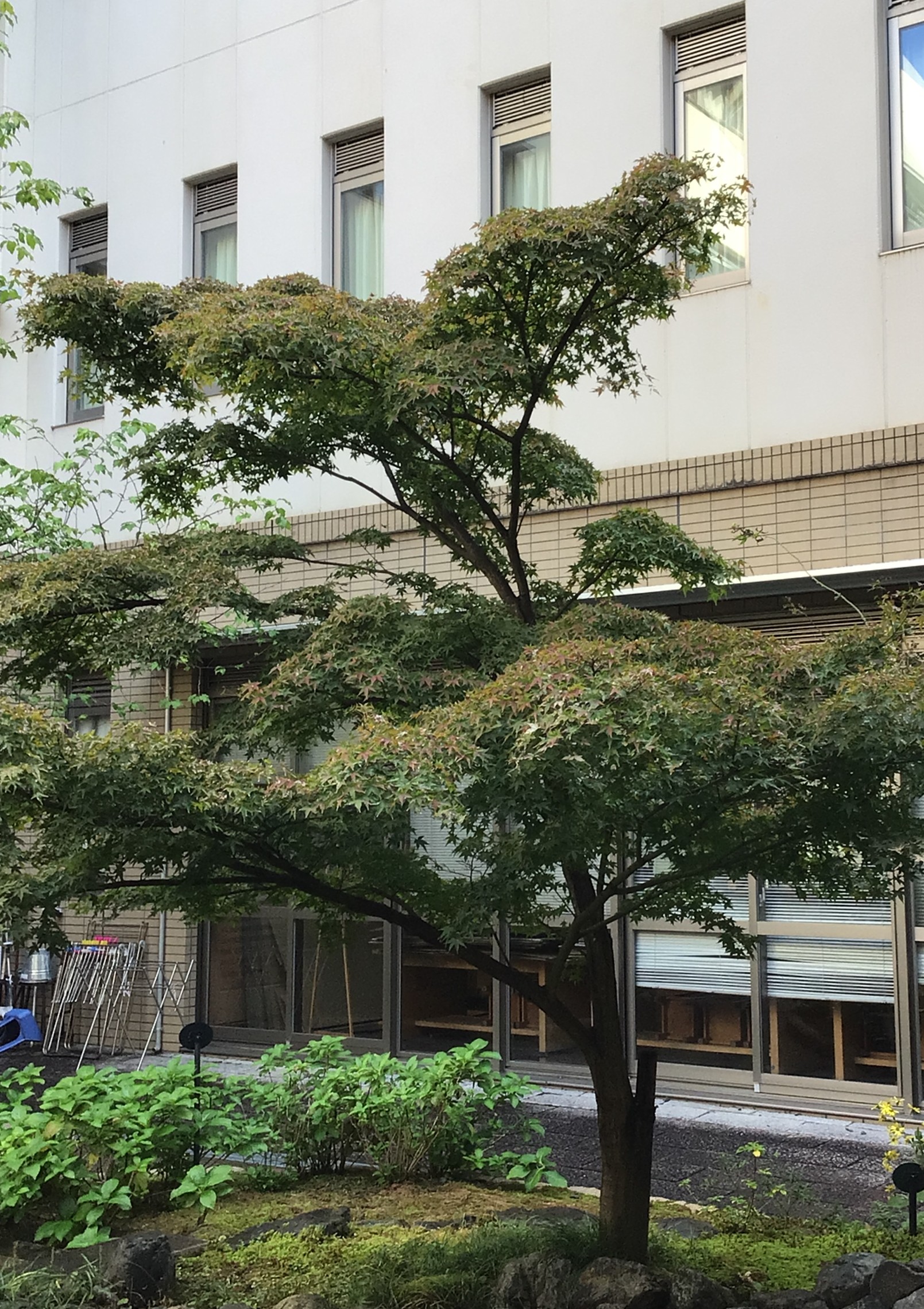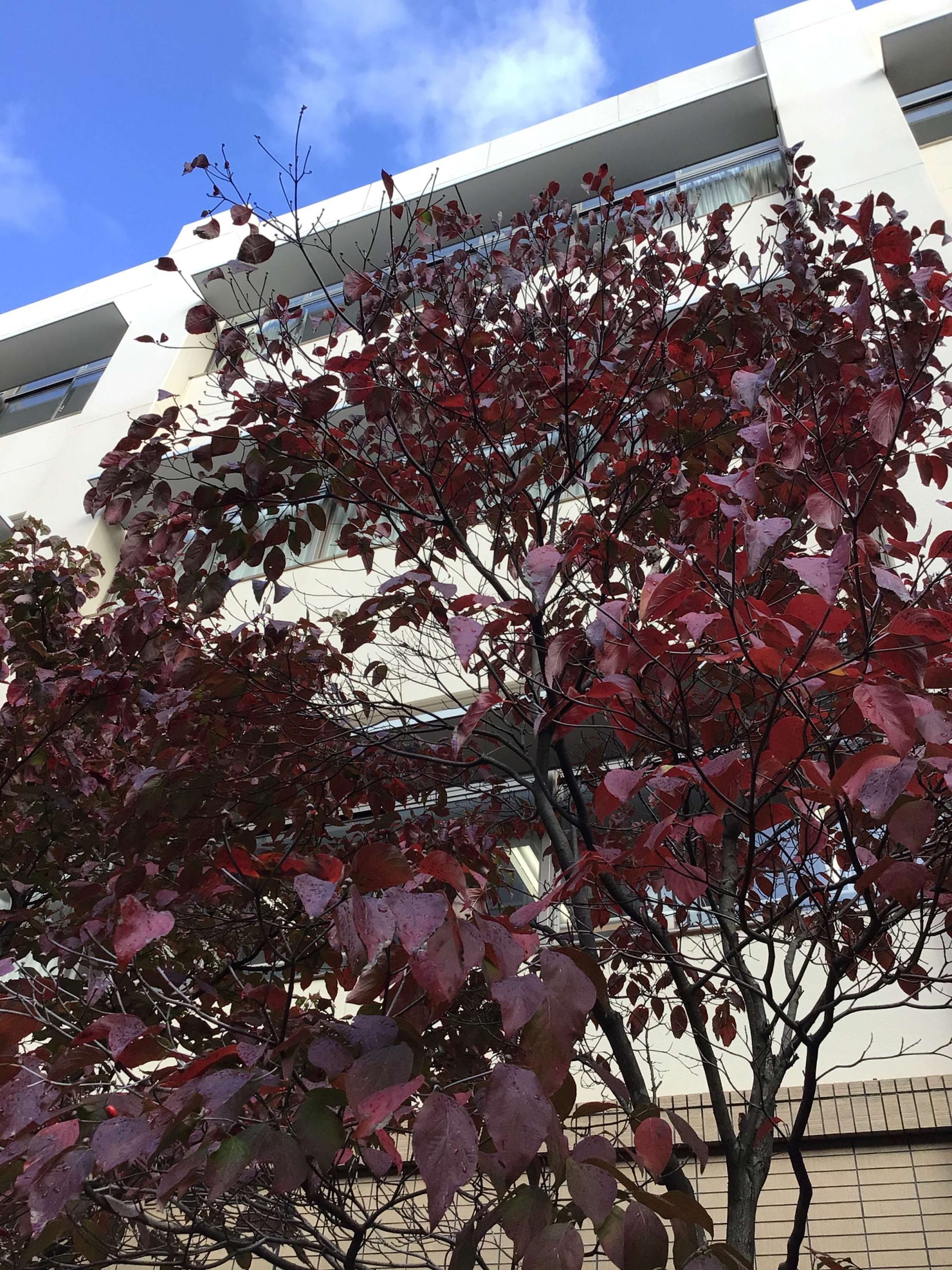 中庭の樹木。紅葉の色づきはまだまだですが、先週までピンク色だったハナミズキが赤くなっています。ようやく秋の気配です。