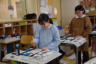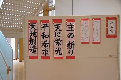 始業日には書き初め会を行いました。子どもたちは心を落ち着かせ、お手本をよく見て一筆ずつ丁寧に書き上げました。本校ではカトリック校として、聖書や祈りの言葉から学年に合った題材を選んでいます。 1年生「アレルヤ」 2年生「天のくに」 3年生「主の祈り」 4年生「天に栄光」 5年生「平和希求」 6年生「天地創造」です。