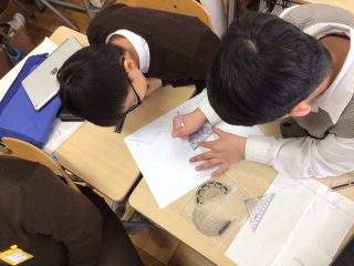 4年生の算数の授業で、分度器を使って角の大きさをはかったり、実際に角をかいたりする勉強をしました。ただ指定された角度をつくるのではなく、「ゲーム形式」で行いました。ゲームのルールは次のとおりです。まず、友だちと向かい合って同じ紙を見ながら、それぞれが線をかいています。自分の線を相手の線につなげることができたら「勝ち」となります。相手から線をつながれそうになったら、分度器を使って角をつくり、うまく逃げるように線をかきます。反対に相手の線につなげて「勝ち」をねらうときにもやはり分度器を使って角をつくります。この活動を通して子どもたちは、分度器の正しい使い方をくり返し練習することができました。子どもたちは楽しみながら、何度も分度器を使って角度をつくっていました。